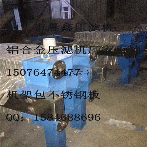 泊頭市晨鑫壓濾機設備公司是從事金屬材質壓濾機的企業。有著豐富的生產經驗。生產鋁合金保溫壓濾機濾板的廠家,供應鋁合金保溫壓濾機濾板,內襯不銹鋼管、銅管,本公司歡迎來電咨詢.下面我們來介紹一下廂式鋁合金壓濾機的型號及種類:鋁合金壓濾機產品規格有380、520、710、800、920、 1000、1250、1500、1600、2000型,過濾面積由0.5m2-2000m2;耐熱溫度-20℃—120℃,濾液流出方式有明流、暗流、可洗、不可洗。過濾壓力從0.2Mpa-2.0Mpa。晨鑫壓濾機按材質可以分為鑄鐵、增強聚、玻纖耐高溫聚、鋁合金、不銹鋼、橡膠板框壓濾機等供選擇。高,清洗濾布也有自動裝置,一般更換濾布的次數也不會頻繁。